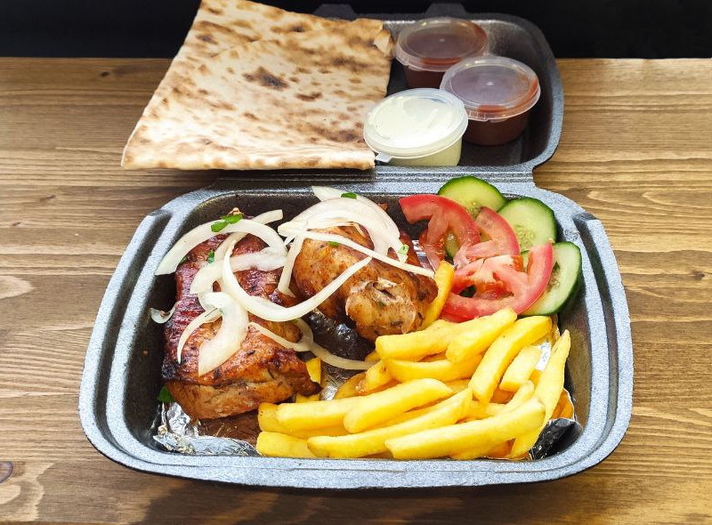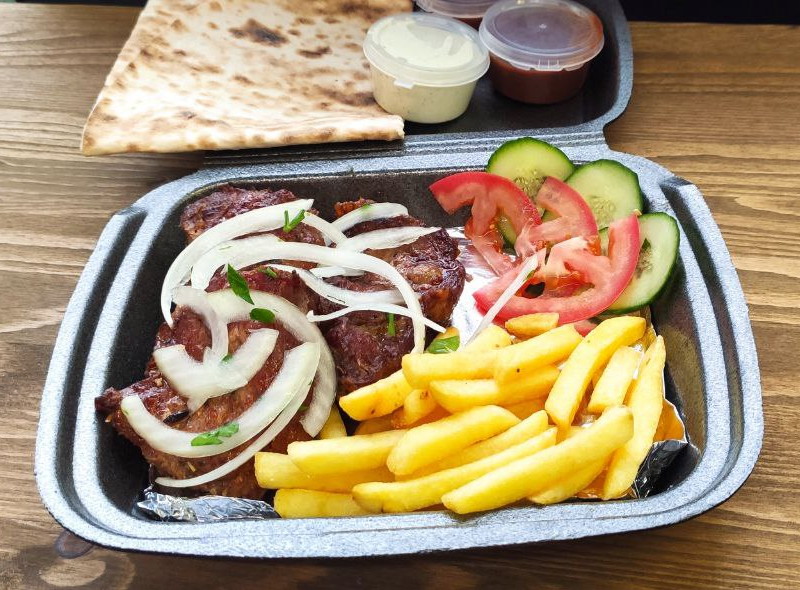 Состав: свиная шейка ~300гр, картофель фри 100гр, помидоры, огурцы, лук с зеленью, соус на выбор