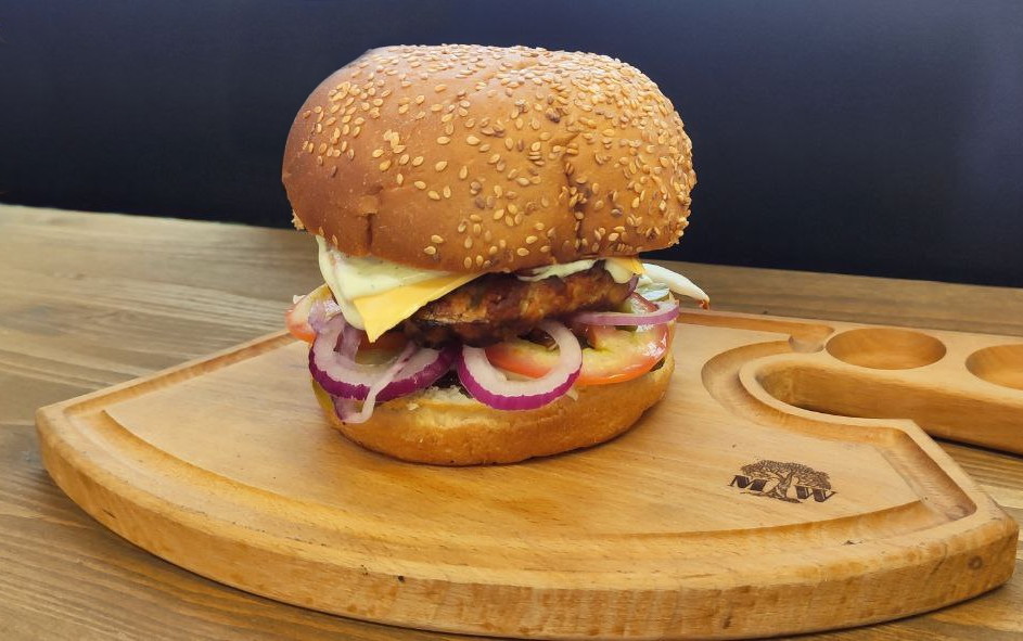 Состав: булочка с кунжутом, фирменный соус, сыр плавленый, котлета, помидоры, маринованные огурчики, лук красный.