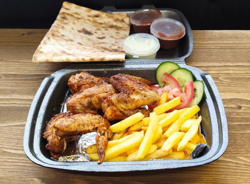 Состав: крылышки ~300гр, картофель фри 100гр, помидоры, огурцы, соус на выбор