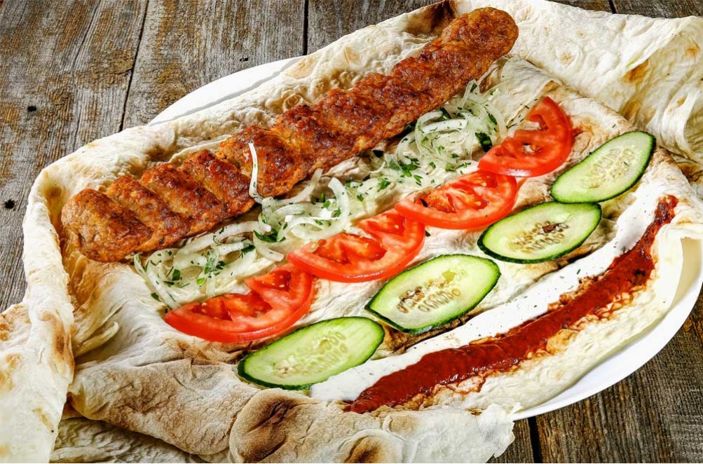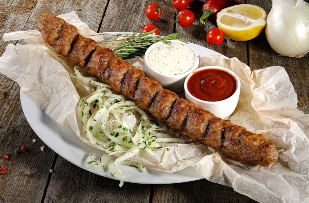Состав: люля-кебаб из говядины, армянский лаваш, лук с зеленью