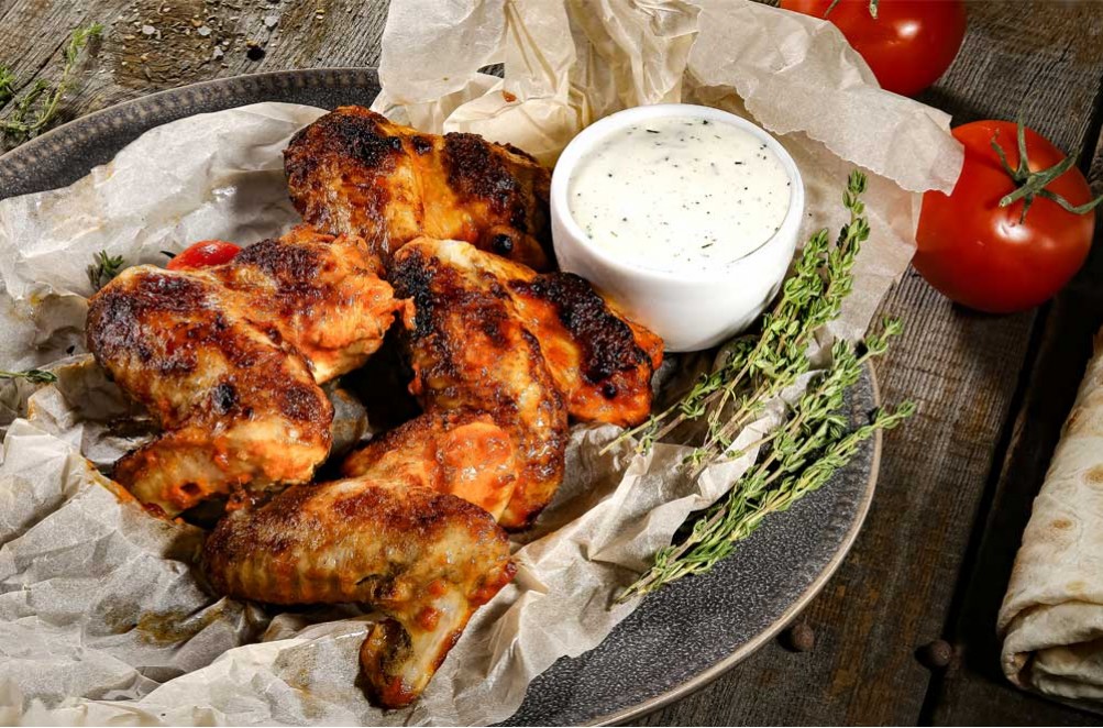 Состав: крылья в фирменном маринаде приготовленные на углях 5шт, армянский лаваш, лук с зеленью